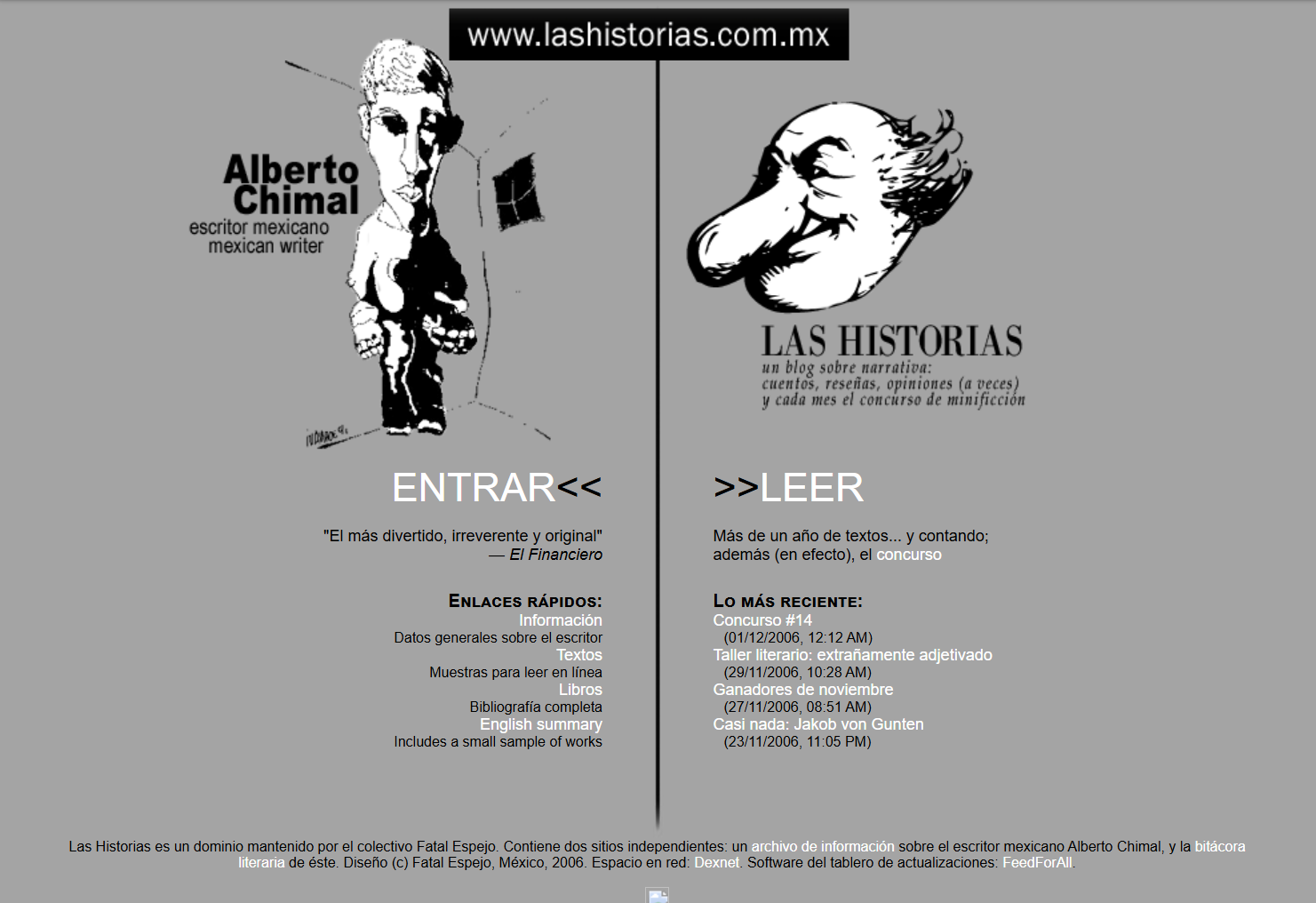Por otra parte, algo queda de aquellos tiempos: además de que la mayor parte de su archivo está intacto, Las Historias está tan «hecho a mano» como es posible, incluyendo porciones que siguen siendo creadas directamente en código HTML. Sin duda habrá un modo más eficiente de hacerlas, pero no me interesa buscarlo. Este proyecto se asume lento y laborioso. Además, un placer perdido de los primeros tiempos de la publicación en línea era la posibilidad de crear y expresarse mediante el diseño: hacerlo bien, mal o regular no importaba, porque se sabía que cada persona que lo intentaba estaba explorando un territorio nuevo, que en su momento llegó a parecer inagotable. Eran otros tiempos de internet y las rutas que podía haber seguido eran más abundantes que ahora.