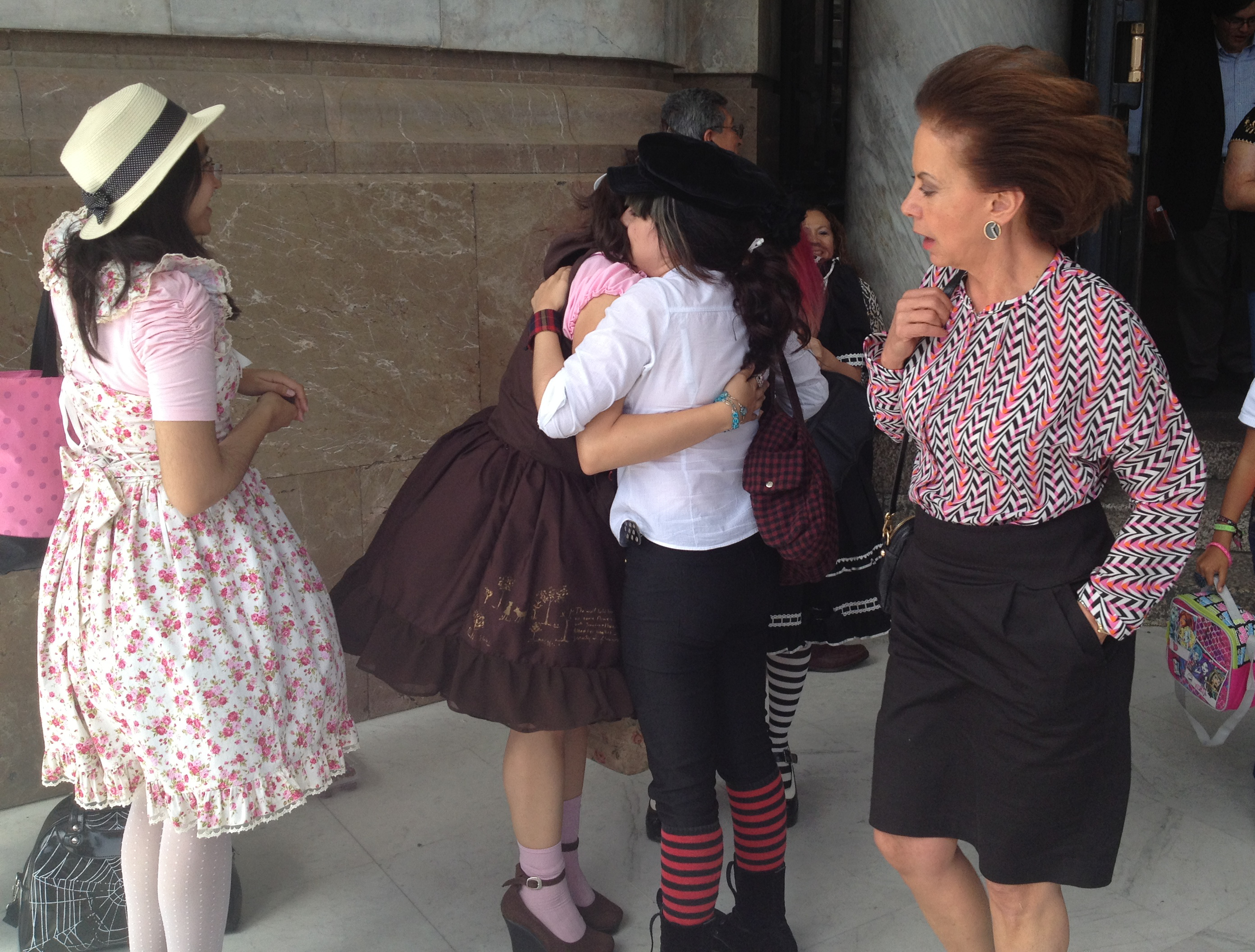 cómo dos alumnas se abrazaban al momento de salir de clases.