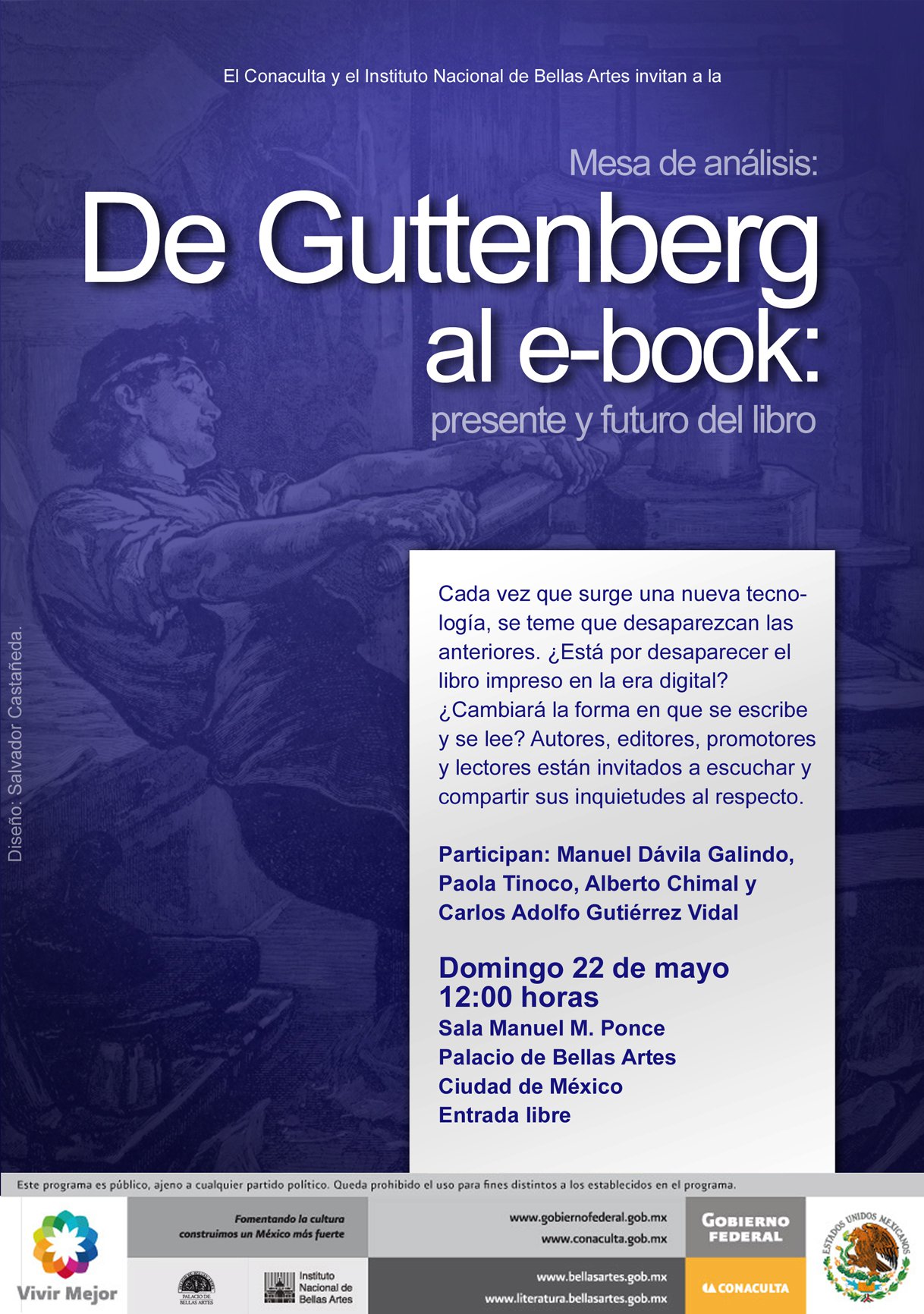3. Por último, este domingo 22 de mayo a mediodía estaré en una mesa redonda en el Palacio de Bellas Artes de la ciudad de México (Juárez y Eje Central), en la sala Manuel M. Ponce. La mesa se llamará «De Gutenberg al e-book: presente y futuro del libro», y por supuesto tratará ese tema (del que también, por cierto, debo una nota aquí en Las Historias, cuando menos para entregar resultados de este pequeño experimento). En la mesa, que será moderada por Epigmenio León, estaremos Paola Tinoco, Manuel Dávila Galindo, Carlos Adolfo Gutiérrez Vidal y yo. Si van, allá nos vemos…[/fusion_builder_column][/fusion_builder_row][/fusion_builder_container]