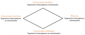 Para aclarar más la distinción entre las que podríamos llamar colecciones caóticas de cuentos (las más convencionales, que reúnen simplemente una serie de textos de un mismo autor, sin atención a su efecto como conjunto) y las «colecciones-novela», se puede considerar el entrelazamiento entre los diferentes segmentos del texto —que sería, evidentemente, notable en estas colecciones nuevas y más aún en las novelas convencionales, cuyos capítulos son divisiones de una única historia— y de la homogeneidad del mundo narrado. Se puede incluso intentar un esquema: